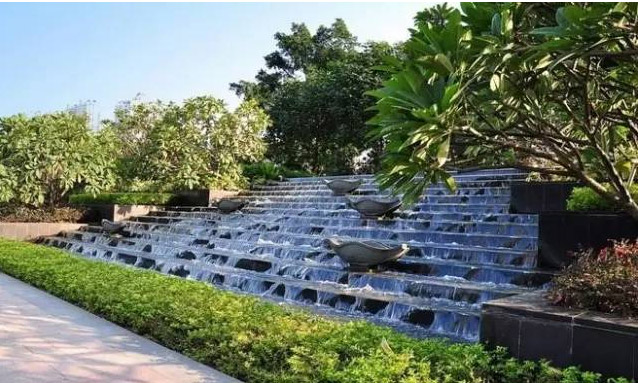 噴泉中的水分層連續(xù)流出,或呈臺階狀稱為疊水。“有山皆是園,無水不成景”,高低錯落的臺階,清脆悅耳的潺潺流水,給人以回歸自然的享受。