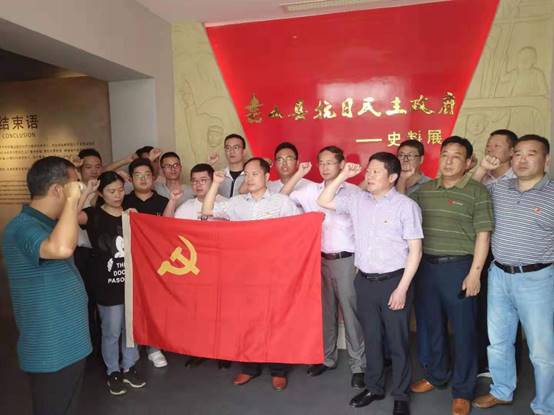 在紀(jì)念館史料展廳背景前,面對(duì)鮮紅的中國(guó)共產(chǎn)黨黨旗,全體黨員莊嚴(yán)地舉起右手,握緊拳頭,集體宣讀入黨誓詞,重溫入黨時(shí)的莊嚴(yán)承諾和堅(jiān)定決心。