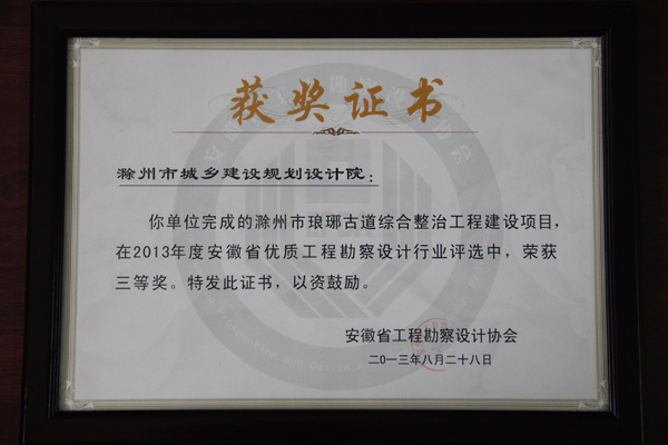 安徽省工程勘察設(shè)計(jì)協(xié)會(huì)于2013年8月3日組織專家召開安徽省優(yōu)秀工程勘察設(shè)計(jì)行業(yè)獎(jiǎng)評(píng)審會(huì),對(duì)全省共62家單位上報(bào)的320個(gè)項(xiàng)目進(jìn)行了為期兩天的評(píng)選。由我院市完成的滁州市瑯琊古道綜合整治工程建設(shè)項(xiàng)目在2013年度安徽省優(yōu)秀勘察設(shè)計(jì)行業(yè)評(píng)選中,榮獲三等獎(jiǎng)。